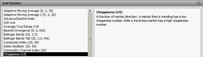 Descriptions for each chart study are now presented to the user from the Add Studies dialog box. When a study is selected on the left side, a short description of the study will be presented on the right side of the dialog box.